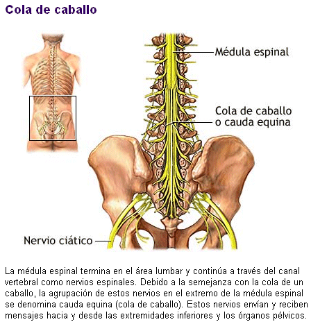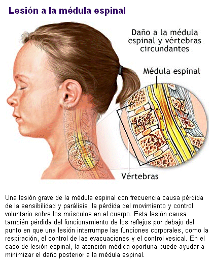 La médula espinal es un cordón nervioso, blanco y cilíndrico encerrada dentro de la columna vertebral. Su función más importante es conducir, mediante los nervios de que está formada, la corriente nerviosa que conduce las sensaciones hasta el cerebro y los impulsos nerviosos que lleva las respuestas del cerebro a los músculos.